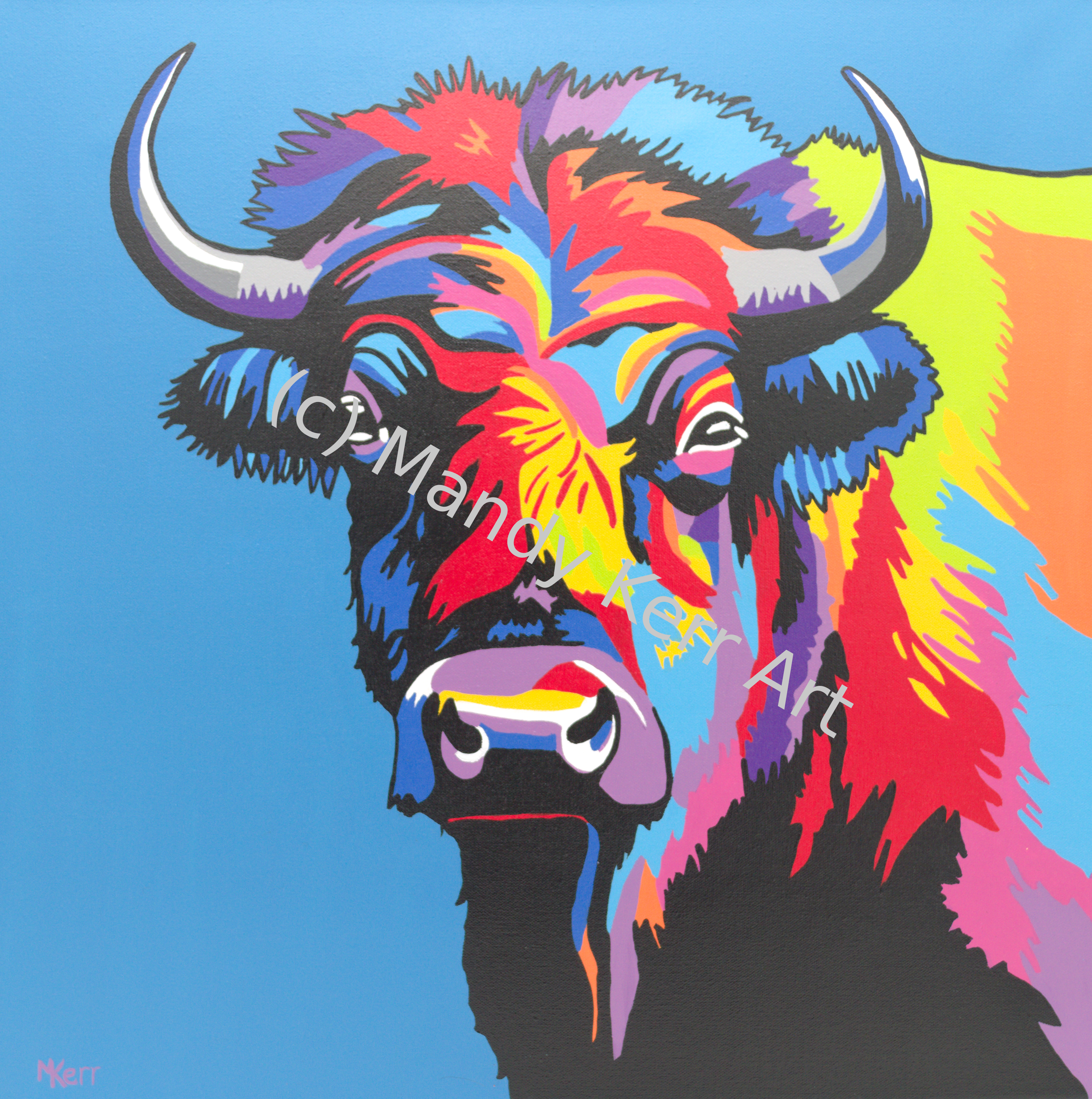 Bella the bison measures 24 x 24 x 1.5 inches on gallery wrapped canvas. If you love bison and bold colors, this might be the piece of art for you!